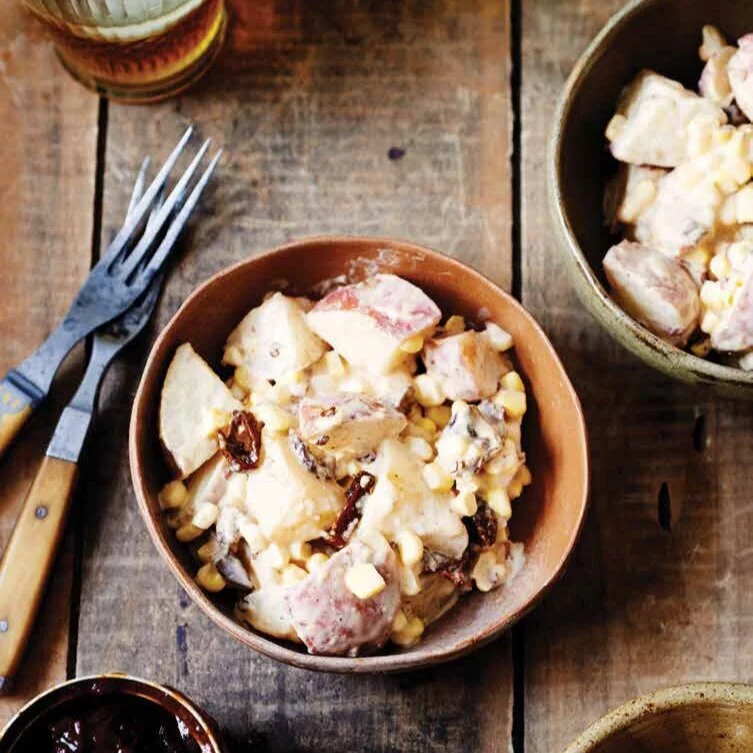 3. In a bowl, combine mayonnaise, chipotle peppers with adobo sauce, lime juice, and corn, stirring to blend. Add potatoes and toss gently. Season to taste with salt and pepper. Add more chipotles if you like a spicier potato salad. This potato salad can be made one day ahead. Serve chilled.